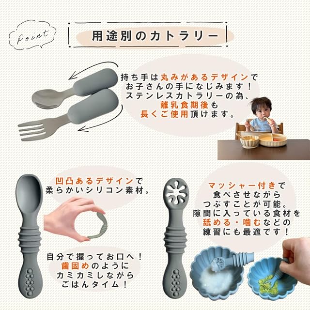 【カトラリー:シリコン】マッシャー付きのカトラリーです。お皿の中でつぶすことが可能で、そのまま食べさせる事が可能です。また、隙間に入っている食材を舐める・噛む等の練習にも最適です。麺類なども絡むので食べやすい構造となっており、やわらかい離乳食も絡めとります。柔らかいシリコン素材の為、口を傷つけにくく凹凸があるデザインの為、歯固めとしてご使用も可能です。(喉につかえないよう、目を離さないで下さい。)