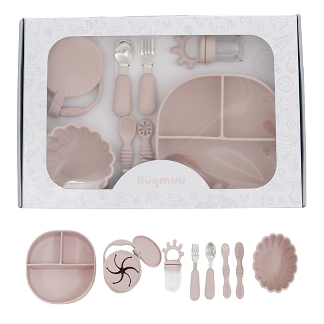 離乳食 食器セット 8点セット お食事セット 吸盤 ひっくり返らない 女の子 男の子 赤ちゃん 子供 シリコン hugmuu (Powder Pink)