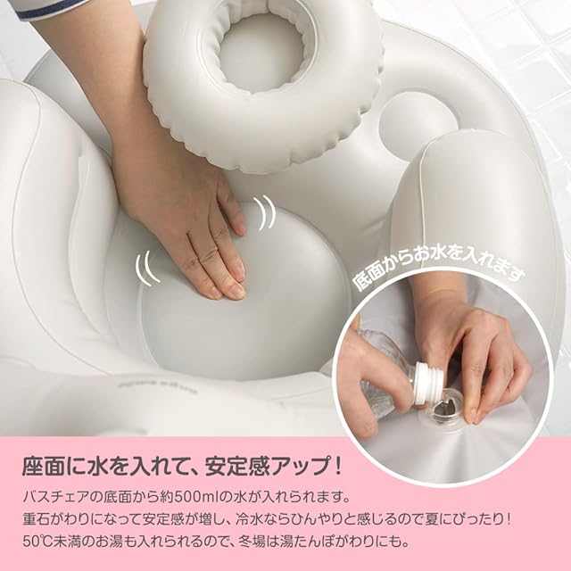 赤ちゃんのバスチェアや、お部屋でのベビーチェアとしてもお使いいただけます。底面に水またはお湯を入れることで、安定感が増し座り心地も快適になります。夏なら冷水を入れてひんやり、冬は50℃未満のお湯を入れて温座にも。赤ちゃんのズレ防止ストッパーはマルチボウルにもなっており、お気に入りのおもちゃやペットボトルなどが入れられます。赤ちゃんが遊べ、むずがらず長く座れる工夫をプラスしました。おさえタブを足で踏むことで、お子様をチェアから抱き上げやすくなります。