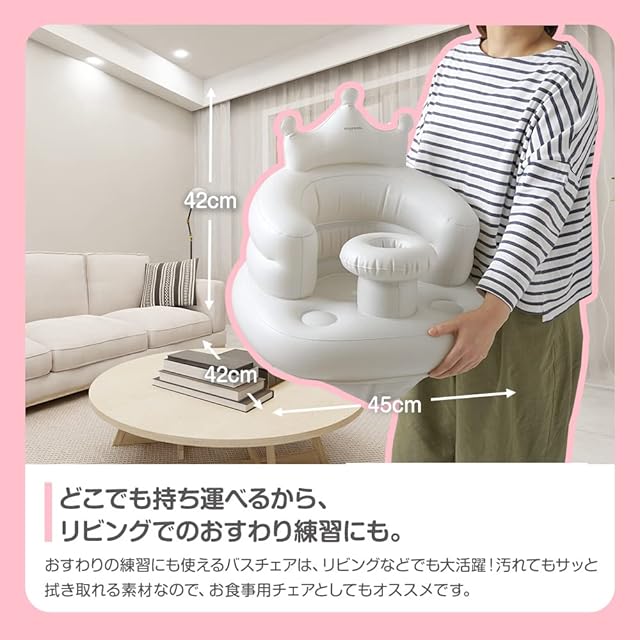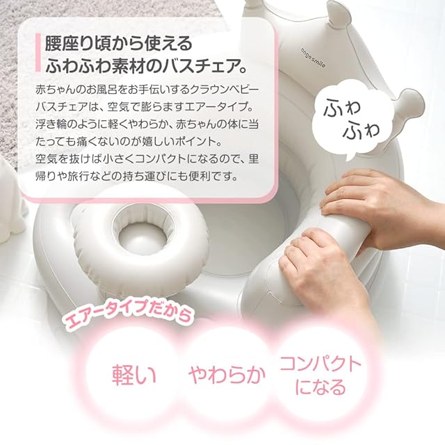 7ヶ月以降の腰すわり頃から使える使えるふわふわ素材のベビーバスです。空気で膨らませるエアータイプで、浮き輪のように軽くやわらか。赤ちゃんの体にあたっても痛くありません。他にないクラウンデザインで、赤ちゃんも小さな王様気分!