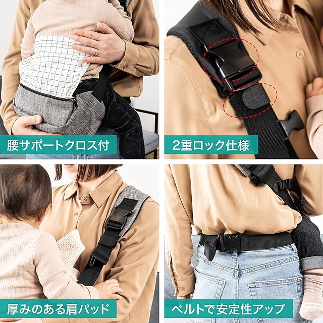 【あんしん機能】お子様の腰回りを支える腰サポートクロス、バックルとマジックテープの2重ロック、厚みのある肩パッド、安定性をアップするウエストベルトなど、ヒップシートとしてのサポート機能が充実。保護者の肩の負担を抑えながら、お子様の安全性にも考慮した設計です。