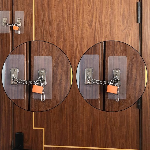 ATHULYA ドア ロック ベビーガード 網戸ロック 冷蔵庫 鍵2つ 引き出し 窓 室内 鍵 穴あけ不要 ファイル引き出しロック 冷凍庫ドアロック キャビネットロック 南京錠あり (1/2/4枚セット)各セットの内容は ステッカー2枚+チェーン1+南京錠1 (2枚セット)