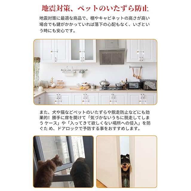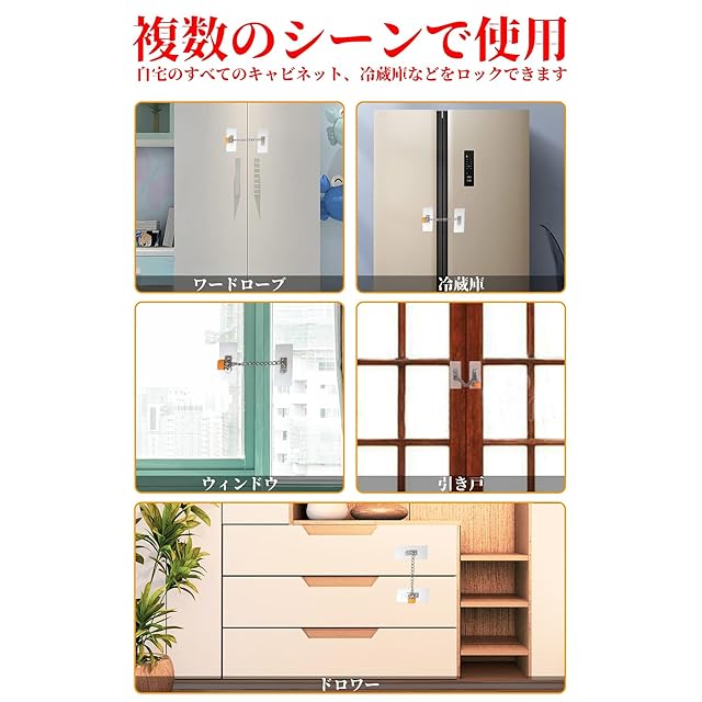 【幅広い用途】窓やドアに取り付けることで、窓が開きすぎないように制限したり、開き戸が開かないようにすることが簡単にできます。チェーンの長さは約20cmで、その長さの範囲で好きな箇所をロックすることができます。冷蔵庫ロック、ファイル引き出しロック、キャビネットロック、ペーパートレイロック、物置ロック、プリンタートレイロックなどとして使用できます。