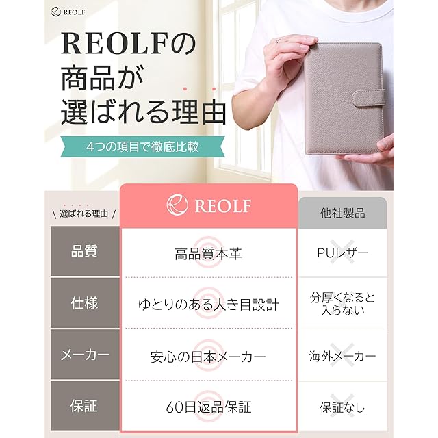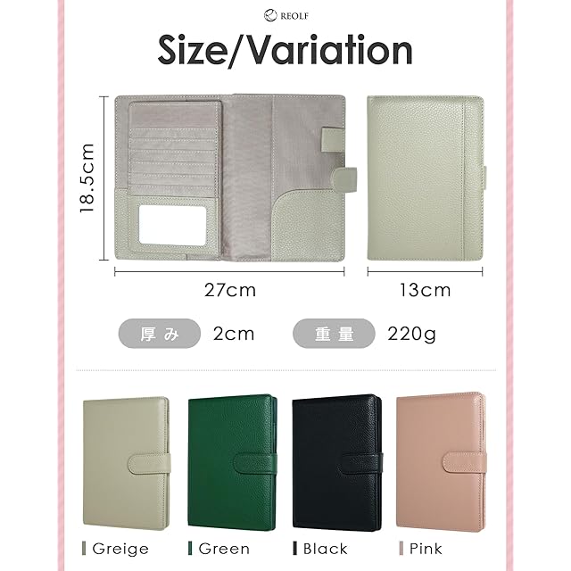 ✅【商品仕様】サイズ:27cm×18.5cm×2.0cm(折畳み時横サイズ/13cm) カラー:グレージュ/グリーン/ブラック/ピンク 重量:220g 素材:高品質シボ牛本革 ブランド:REOLF