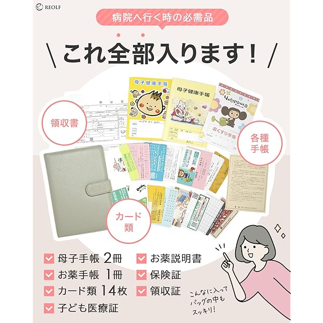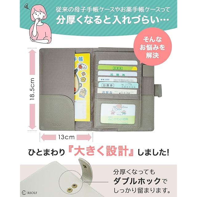 ✅【大きめ設計のマルチケース】大きめ設計の本ケースは、分厚くなってもスムーズな出し入れを可能にするダブルホックを採用。母子手帳2冊、お薬手帳1冊、保険証やカード類14枚など、様々なアイテムをしっかり収納できます。