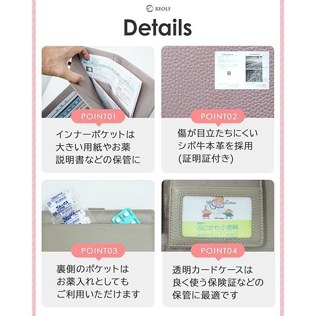 ✅【製品の特長】内部には診療明細書やお薬説明書などの書類を整理できるインナーポケット、裏側にはお薬を入れるのに便利なポケットがあります。透明カードケースは、よく使う保険証の保管に最適。