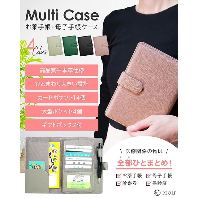 [REOLF] 母子手帳ケース お薬手帳 おくすり手帳 ケース 本革 大容量 Sサイズ A6 マルチケース 診察券入れ 保険証 ギフト (Green)