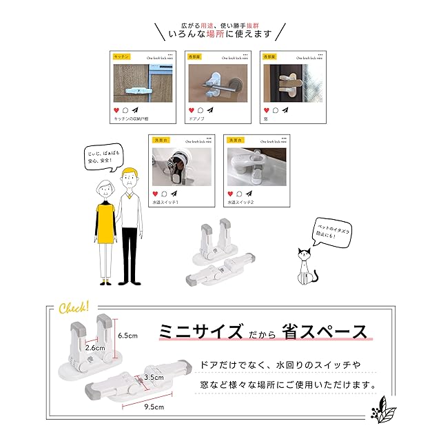 ベビー用危険防止のドアレバーストッパーとしてだけでなく事故や怪我防止セーフティロックのキーレスロック、猫などペットのイタズラ対策としてもご使用いただけます。