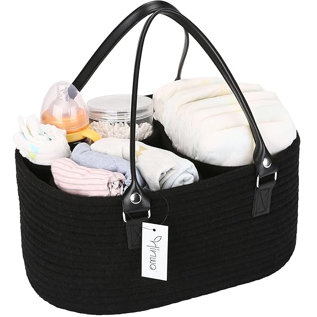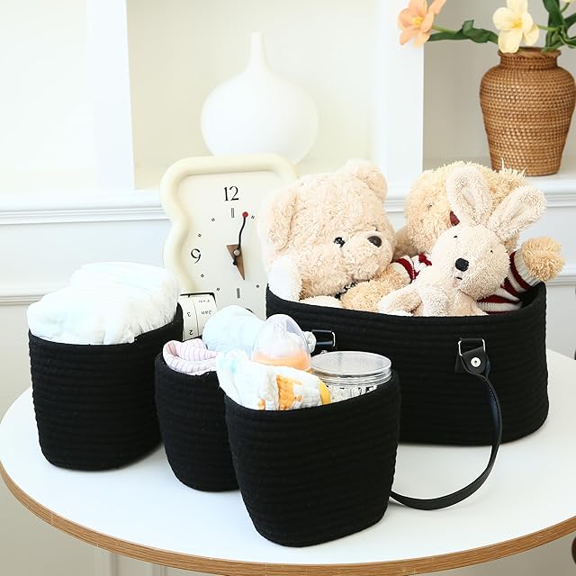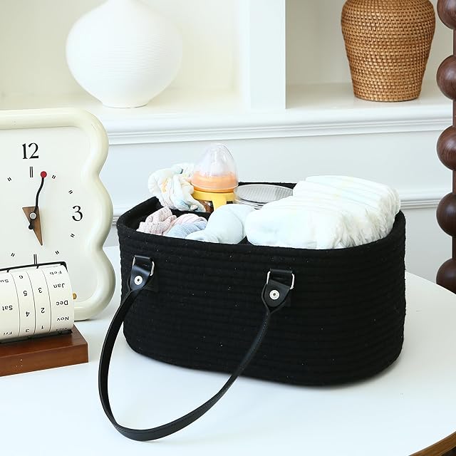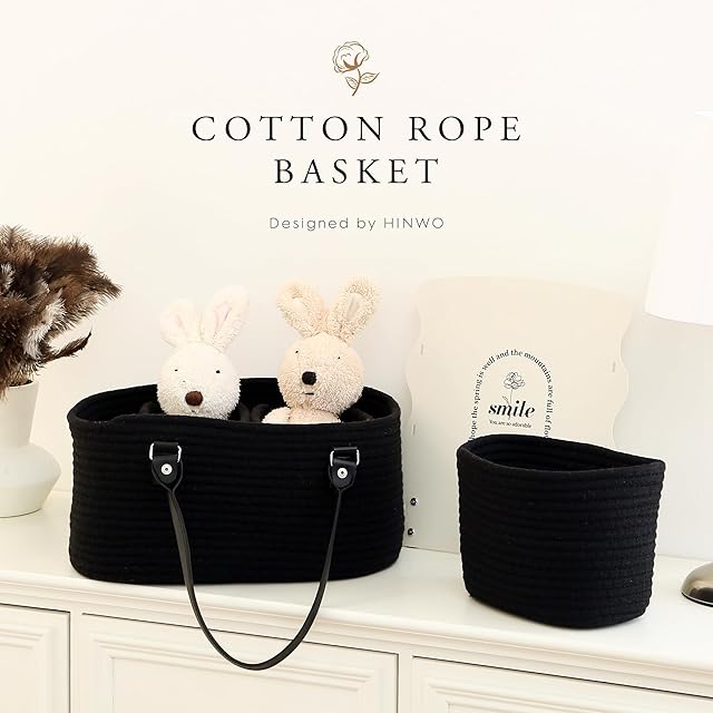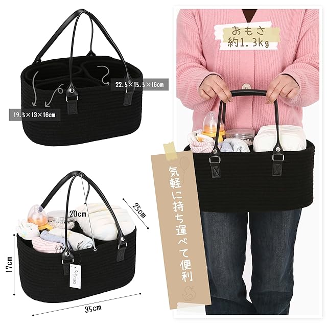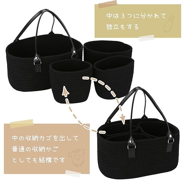 Hinwo おむつ収納バッグ おむつストッカー オムツ入れ ベビー用品収納 収納ケース カゴ バッグ ボクス ロープバスケット ロープストレージ おしゃれ収納 小物入れ 赤ちゃん 出産準備 出産祝い(35X27X17cm ブラック)