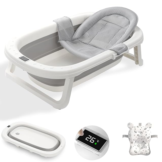ベビーバス 折り畳み お風呂 ベビー 赤ちゃん 沐浴 湯温計 バスネット バスクッション付き 浴槽 収納しやすい バスタフ 出産祝い ギフト (グレー)