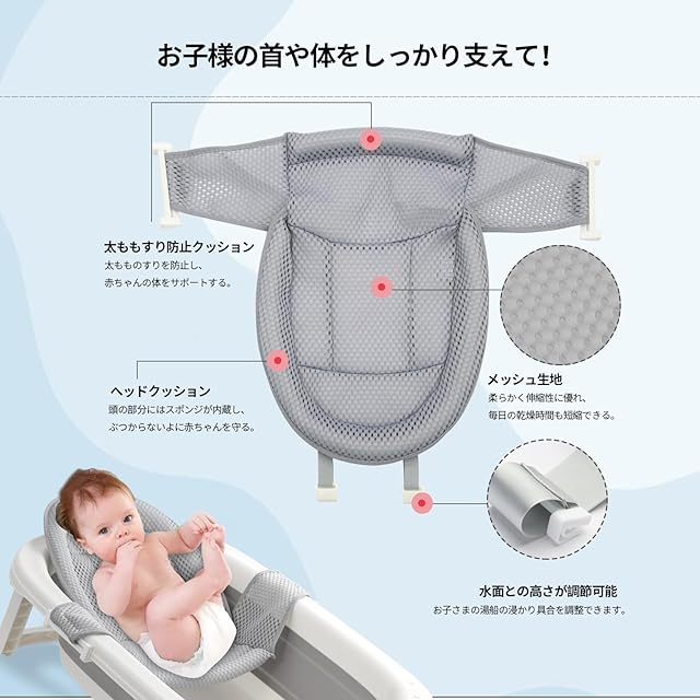 「バスネットとバスクッション付き」:ベビーバスに付属したバスネットとバスクッションは複数のストラップを備え、しっかりと固定でき、安心感があります。お子様の体をしっかり支えて、ママ一人でも楽にできる!調節できるタイプで、お子さまの湯船の浸かり具合を調整できます。