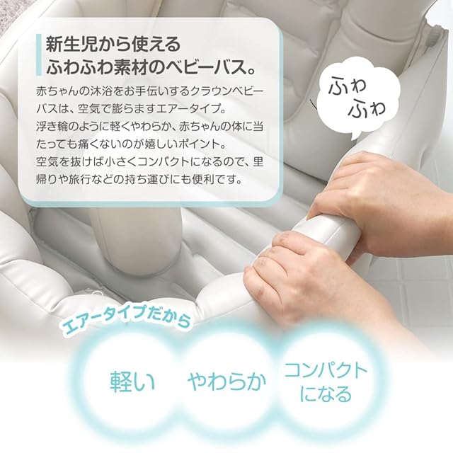 新生児から使えるふわふわ素材のベビーバスです。空気で膨らませるエアータイプで、浮き輪のように軽くやわらか。赤ちゃんの体にあたっても痛くありません。他にないクラウンデザインで、赤ちゃんも小さな王様気分!