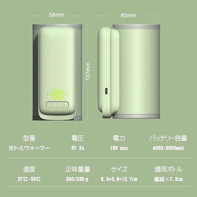 「製品仕様」 型番:ボトルウォーマー 電圧:5V 電力:18W max バッテリー容量:6000mAh 温度:37℃-55℃ 正味重量:300g サイズ:8.5*5.8*13.7cm 適用ボトル:直経≤7.2cm。注意:消費電力5V2A以上のACアダプターに使用してください