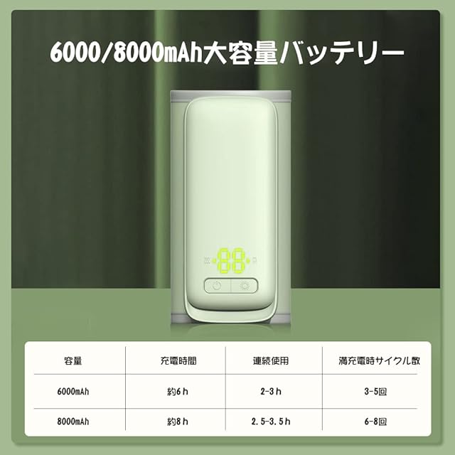 「6000mAh放電容量」このボトルウォーマーはUSB給電式です。移動電源(別売り)、車のUSBインターフェイス、コンピューター、プラグなどは哺乳瓶カバーに給電できます。電源ななくればでも大丈夫です、本体が6000mAh放電容量があります。小型で便利な持ち運びます