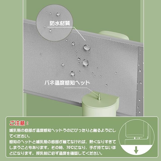 「ご注意」哺乳瓶は別売りです。哺乳瓶の底部が温度感知ベースのにぴったりと触るようにしてください。感知のヘッドが温度測定ができません、高温になりました。授乳前に必ず温度を確認してください