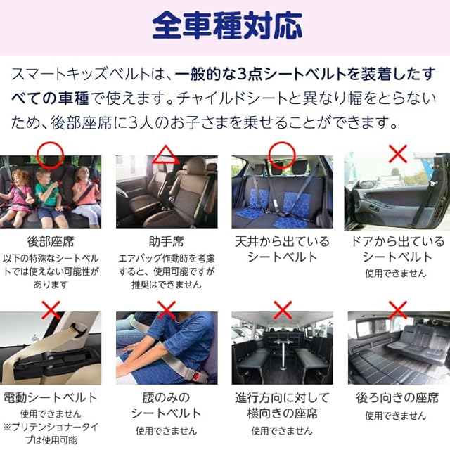 【 使用上の注意 】 ●スマートキッズベルトは、UN R44/04に適合した汎用型 / グループII、IIIの自動車3点式シートベルトの座席専用、年少者用乗車補助装置(ベルト型幼児用補助装置)です。 ●ご使用の適応条件は、体重15kg以上~36kg以下のお子さまです。 年齢は目安となっており、体重15kg~36kgの体格に応じてご使用いただけます。 ●ご使用する際は、お子様を車の座席に座らせた状態で肩と腰をしっかりと背もたれに密着させ、 ベルトが緩まらないように長さを調節して体にフィットさせてください。 ●ブースターシートとの併用はできません。 ●日本国内で登録されている3点式シートベルトが装備された自動車の座席でご使用ください。 ●お子さまの安全のため、ご使用前に必ず説明書や公式動画をご確認いただき、ご使用方法など十分にご理解いただいた上で、正しくご使用ください。 ●クリップはお子様がベルトを外さないように、衝撃時に簡単に外れないよう安全の為、硬めの仕様になっております。 ●日本国内での使用を目的に販売しております。