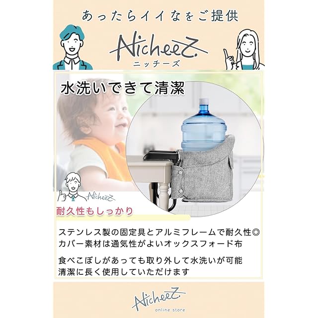 【水洗いできて清潔◎】ステンレス製の固定具とアルミフレームで耐久性に優れ、カバー素材は通気性がよいオックスフォード布。食べこぼしがあっても取り外して水洗いが可能なので、清潔に長く使用していただけます。