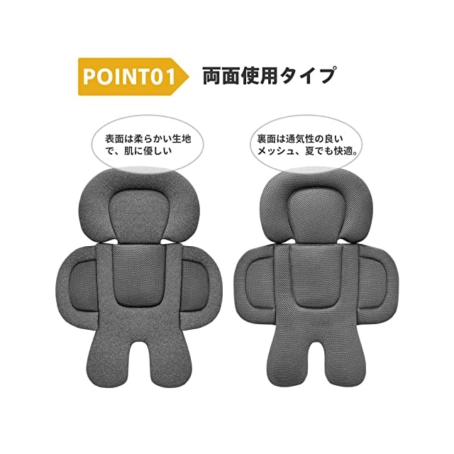 [両面用タイプ]弊社大人気のベビーカーシートは両面用タイプを開発しました。表面は柔らかい生地を使って、赤ちゃんの肌に優しく、ママも安心できます。裏面は3Dメッシュなので通気性に優れ、夏は3Dメッシュの面を表にして使用できます。赤ちゃんは体温が高く、季節関係なく、たくさんの汗をかきます。3Dメッシュで通気性を高めることでいつでも快適に。オールシーズン使用できるベビーカーシートです。