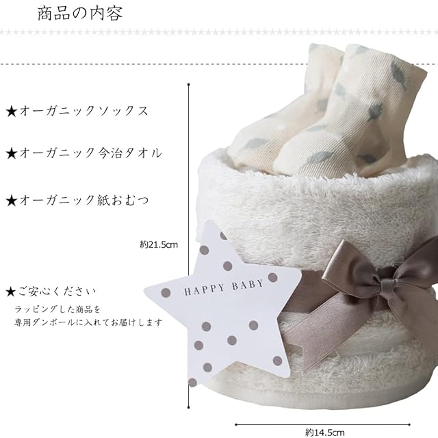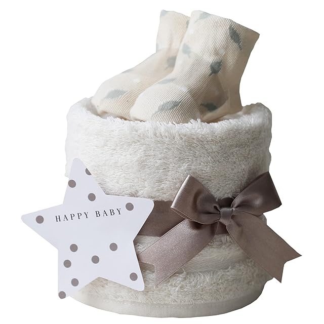 オーガニックコットン おむつケーキ 今治タオル 出産祝い 1段 男の子 女の子 ギフトセット ダイパーケーキ ベビー 日本製 オーガニック ソックス おむつケーキ研究所 ナチュラルムーニー オーガニックコットン テープタイプMサイズ