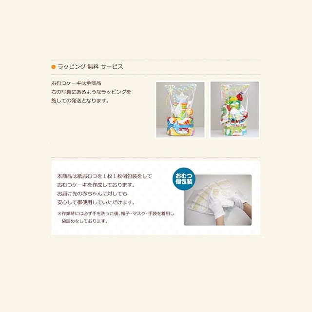 【梱包】おむつケーキに透明セロファンやリボンでラッピングを施し、手提げ袋も一緒に無地ギフトボックスにお入れしております。おむつケーキの持ち運びにご利用くださいませ。 ※Amazon輸送箱にて二重梱包された状態で配送されますので、手提げ袋ご使用の際にはギフトボックスから取り出してご利用ください