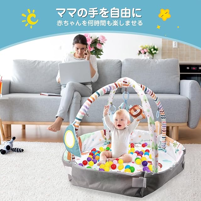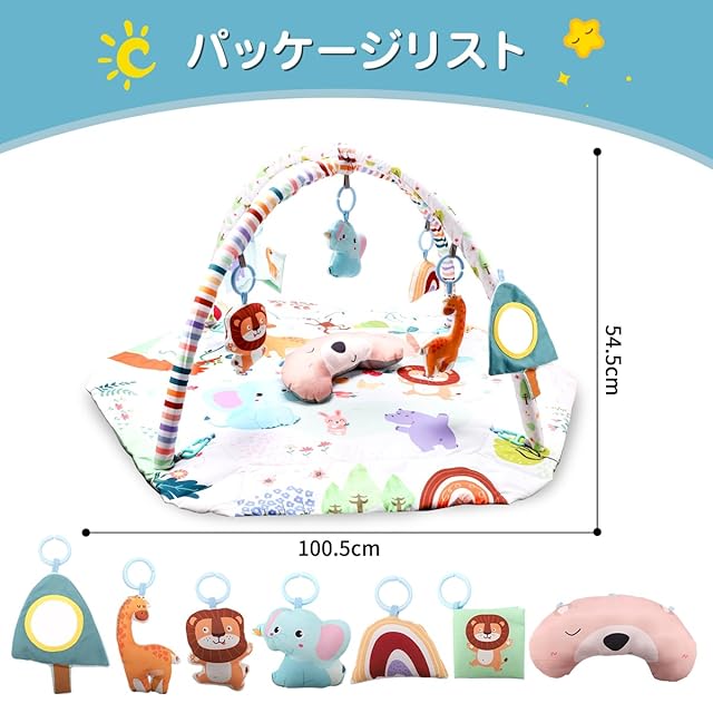 赤ちゃんの五感を刺激できるおもちゃです。感覚を刺激:カラフルなおもちゃ、ゆかいなメロディ、ライトやサウンド、いろいろな手触りが感覚を刺激して、遊びを促します。運動能力の発達:おねんねで運動や、はらばい、寝返りを促し、頭、首を強くするだけでなく、体幹を鍛えることができます。手指の発達:アーチをさげると、いろいろなおもちゃに手が届きます。