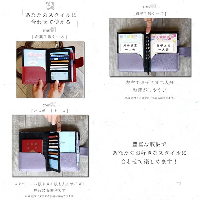 【様々な用途に使える!マルチケース】1つの用途だけでなくマルチに使える設計となっております。母子手帳やお薬手帳を入れて通院グッズをまとめたり、パスポートやメモ帳を入れて旅行で使用したり、スケジュール帳を入れてデイリーに使用したりなど、A6サイズまでのものなら収納可能です!