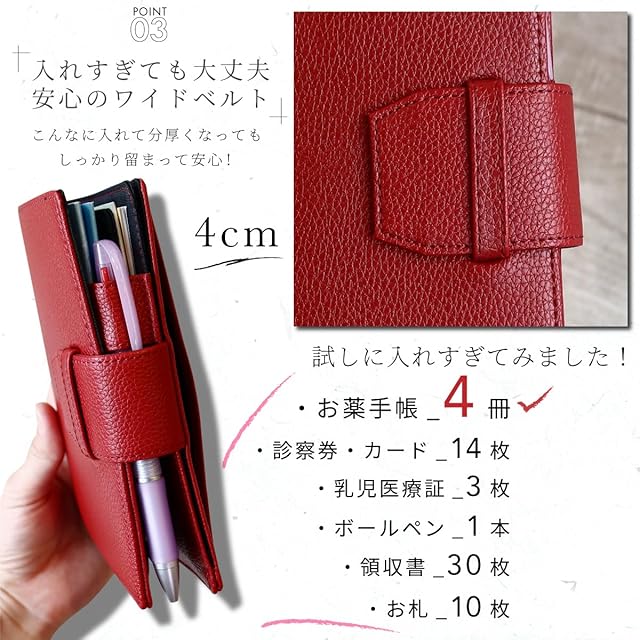【お客さまの声】 「娘用にピンク、息子用にブルーを購入しました。母子手帳や診察券が全て入り、ベルトも差し込みやすいです。耐久性のある本革なので、子供が大きくなったらそのまま一式渡してあげる予定です。」