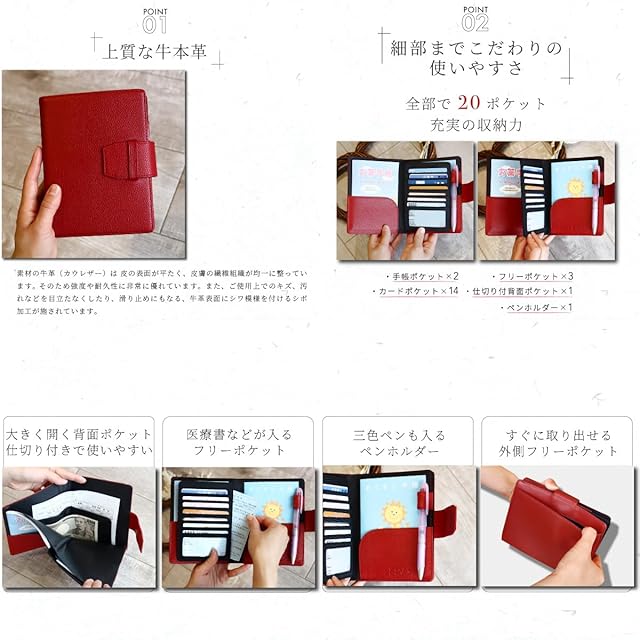 【ポケット20個充実の収納力】手帳ポケット×2 カードポケット×14 仕切り付き背面ポケット×1 フリーポケット×3 ペンホルダーも1つ付いております