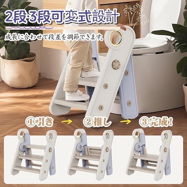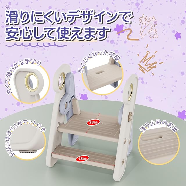 「頑丈・安全設計」:こちらはお子様用にトイレや洗面所などでとっても便利な踏み台です。高品質なプラスチック素材を採用しており、無毒頑丈で、耐久性に優れています。立つ部分は滑り止めデザインで安心です。また、底面には滑り止めマット付きで、安定して、床に擦り傷などが付きません。