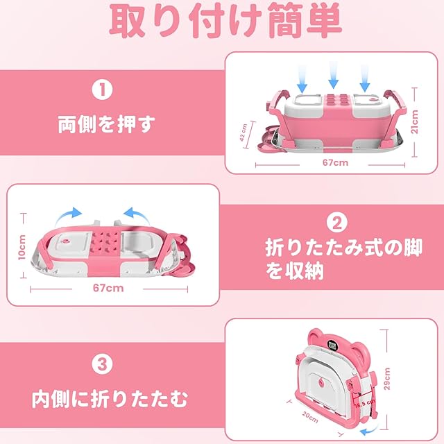 【持ち運び·収納が便利】赤ちゃんに優しいゴム素材を使用し、折りたたみができるバスタブなので、必要なときに広げて使用し、使用しないときにはコンパクトに収納することができます。折りたたみ後はわずか9cmとなり、隙間収納が可能です。吊るしておける穴があり、壁掛けでもできるからカビずに清潔!脚部分にはTPE滑り止めパッドが付いており、浴槽が動きにくくなっています。