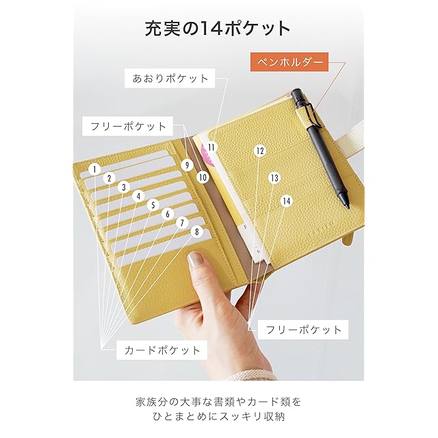 ✅【見開きで一目瞭然】充実の14ポケットで 診察券 や 保険証 などをまとめて収納!右側のあおりポケットは お薬手帳 も出し入れしやすい設計に!・8つの カードポケット と2つのフリーポケット・3つのフリーポケットとあおりポケット(Point) ペンホルダー 付きで ペン も便利に持ち運び♪