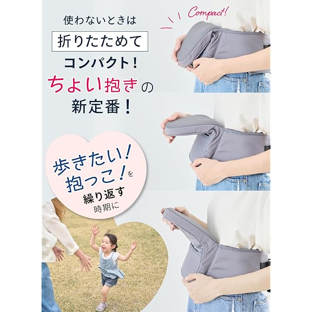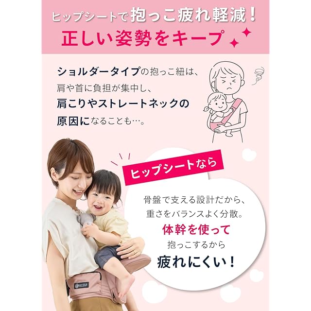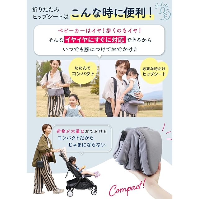 【赤ちゃんと一緒にもっといろんなところへ出掛けたい!】気軽に手軽に使えるので、ちょっとしたお出掛けに!使い方はシンプルなので、ヒップシートが初めてという方はもちろん、二つ目のキャリアーとしてもオススメです♪電車やバスなどの移動時や、荷物が増えるお買い物、お散歩はもちろん、イベントや旅行など、さまざまなシーンでお使い頂けます。アクティブなお出かけはもちろん、赤ちゃんがおねむモードの時も◎!赤ちゃんと密着できるので、お母さんのぬくもりを感じながら、安心して眠れます♪「抱っこ!」「降ろして!」のわんぱく赤ちゃんにもオススメです! 【対象年齢】3カ月~ 【推奨耐荷重】15kg【サイズについて】ウエスト最大90cmまでベルト調節可能 *帝王切開でご出産されたお客様へ:ヒップシートは構造上、下腹部に一定の力がかかる仕様になっております。お子さまの重みで下腹部の痛みが生じる場合がございますのでご注意ください。