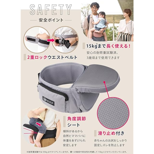 ★他にもオススメpointがいっぱい!★《point1.すべり止め付き》赤ちゃんの座るシート部には滑り止めを施しました。ズレ落ちる心配が無いので安心です。《point2.メッシュでムレ防止》ママパパの腰回りなど、体と密着する部分はメッシュ仕様になっているので、長時間装着していてもムレにくく快適にお使い頂けます。《point3.腹部の負担を軽減するクッション》腰ベルト内側のおなかに当たる部分はクッション仕様になっているので、ママパパのお腹への負担を軽減します。《point4.2重で固定する腰ベルト》腰ベルトはマジックテープでベルトを固定した後にバックルを留め、固定します。2重でしっかり固定されるので安心です。