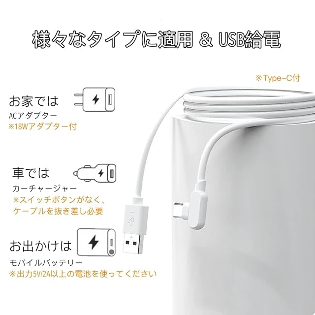【USB給電式・幅広いタイプに対応】ミルクウォーマーはUSBで給電される。1.5mのType-C充電ケーブルが付属する、外出先でも簡単にミルクを温めることができる。※本製品は電池が内蔵されていませんので、給電しながらお使いください。※加熱効果を確保するために、5 V 2 A充電ヘッドを使用してください。調節可能なマジックテープで、ペットボトル、缶やカートン、ガラス瓶など、どんな形状のボトルにもフィットします。(推奨サイズ:直径5~8cmのボトル)