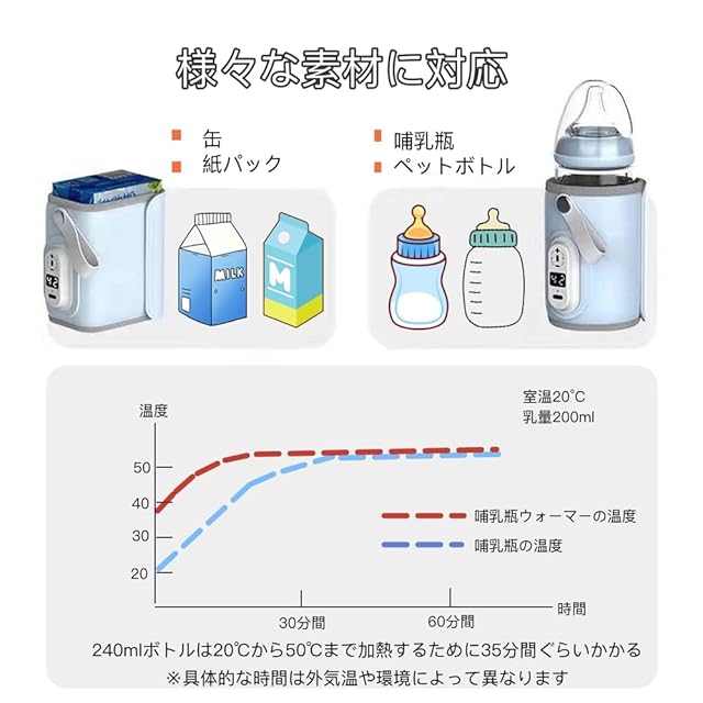 【 ミルク保温器・6段階温度調節】哺乳瓶ウォーマーは熱伝導力が高くて、18W急速アダプター付きで容量240mlの哺乳瓶を20℃から50℃に温めるのに35分しかかかりません。(※加熱時間は主に外気温とボトルの容量に依存する)。「40℃/42℃/44℃/46℃/48℃/50℃」の6段階を細かく調節可能で、気温やお好みによって快適な温度を設定できます。