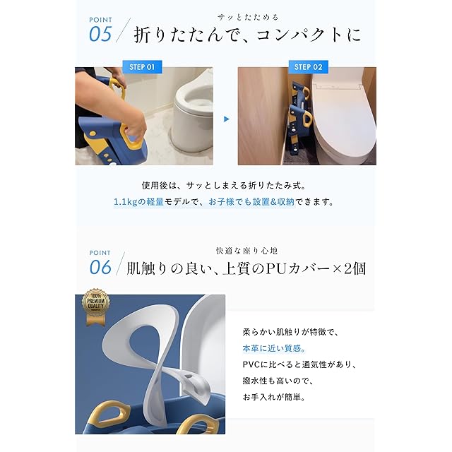 ✅【折りたたんでコンパクトに】使用後はサッとしまえる折りたたみ式。場所を取らないスリムサイズなので、普段は隙間に収納可能です。【1.1kgの超軽量モデル】お子様でも簡単に設置&収納できます。【安心の耐荷重80kg】一般的な補助便座の耐荷重は、約50~75kg。対して、SteadyStepは、国内の検査機関にて80kgまで測定済みです。