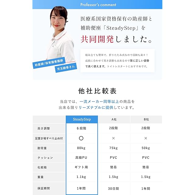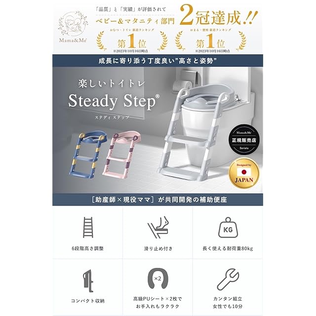 ✅【Mama&Me正規品】「毎日の育児を楽しくする」、ベビー&マタニティ専用ブランドです。【助産師✕現役ママ共同開発】成長するお子様に、ちょうど良い高さと姿勢で使える補助便座「SteadyStep」【成長に合わせた6段階高さ調整】成長しても、高さ調整付きだから安心です。6段階なので丁度良く、長く使えます。身体の大きさに合わせて、常に正しい姿勢で座ることができます。【肌触りの良い最高級PUカバー✕2個】PU(ポリウレタン)特有の本革に近い質感が自慢。柔らかく、もちもちとした肌触りが特徴です。PVC(ポリ塩化ビニル)よりも通気性、撥水性ともに高く、お手入れが非常に簡単です。更にいつでも清潔にご利用頂けるよう、予備のカバーを1つ付属しております。
