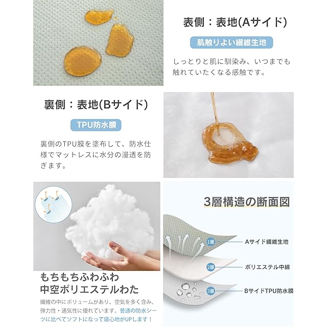 【TPU防水膜で万全の保護】 裏地のTPU防水素材が、液体の浸透を防ぎ、マットレスをしっかりと保護します。