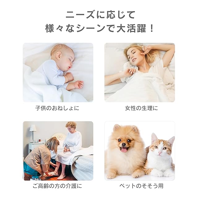 【多用途性と丸洗いOK】 お子様のおねしょシーツや介護用品、ペット用としても最適。洗濯機での丸洗いが可能で、いつでも清潔に保てます。