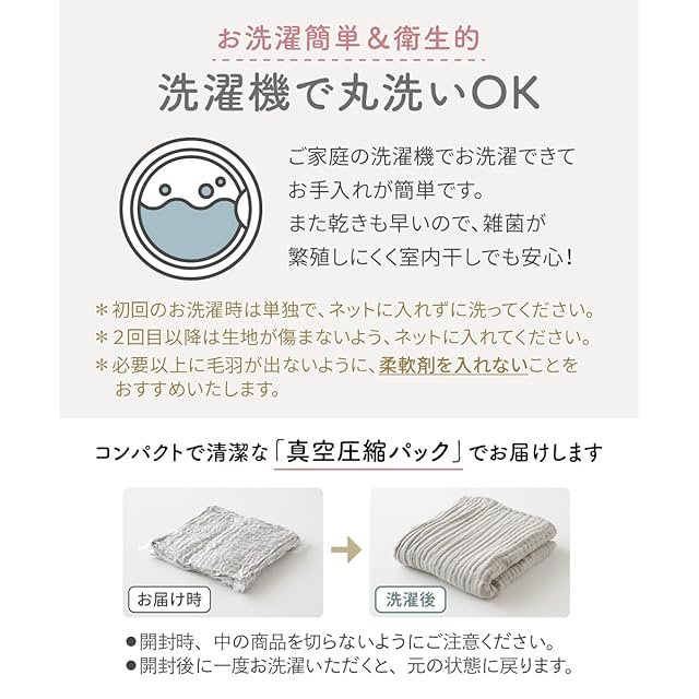 【洗濯機で丸洗いOK 洗うほどさらにふんわり】ご自宅の洗濯機で丸洗いできます。乾きも早いため、雑菌が繁殖しにくく室内干しでも安心。汚れてもこまめに洗えるので、いつでも清潔にお使いいただけます。洗えば洗うほどふんわり柔らかくお肌になじんでより心地よい肌触りに。