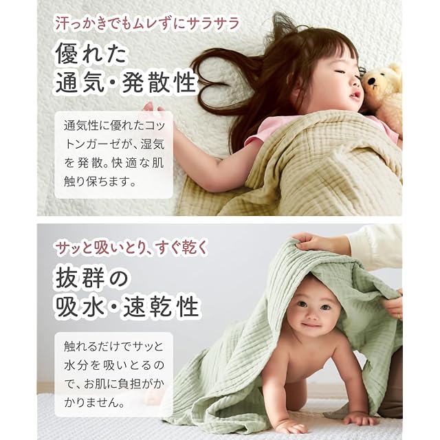 【ムレずにサラサラ 優れた通気性・吸水速乾性】通気性に優れたコットンガーゼが、汗などの湿気をしっかり発散。サラっと快適な肌触りを保ちます。タオルとして使えば、触れるだけでサッと水分を吸いとるので、ゴシゴシこする必要がなくお肌に負担がかかりません。
