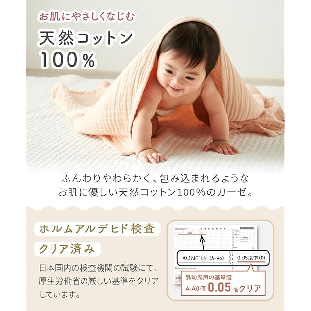 【ベビーにも安心 ホルムアルデヒド検査済み】日本国内の検査機関の試験にて、厚生労働省の厳しい基準をクリアしているので、ベビーやお肌の敏感な方も安心してお使いいただけます。