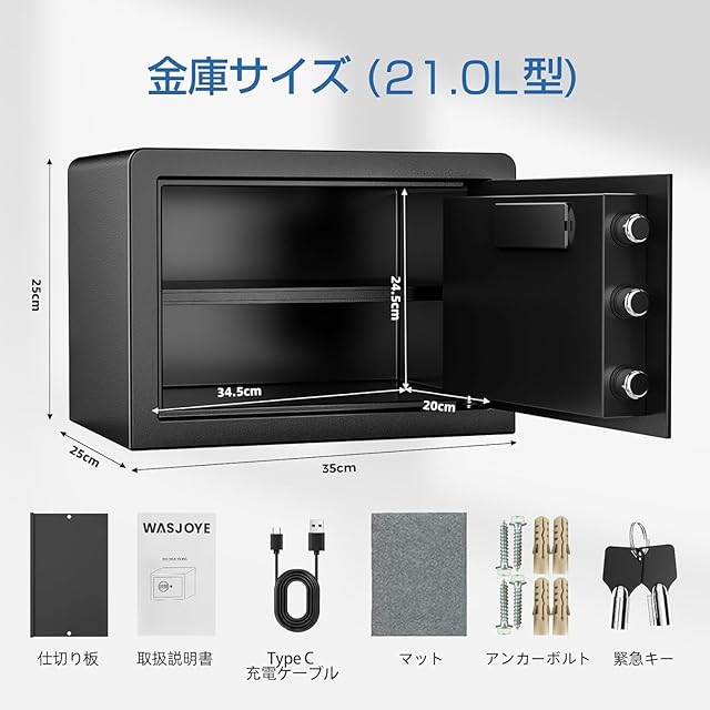 WASJOYE 金庫 家庭用金庫 テンキー式 電子セキュリティーボックス 防犯箱 家庭用 店舗用 業務用 会社用 保管庫 警報アラーム&鍵付き 仕切り板付き A4ファイル・A4封筒対応 床・壁に固定可能 日本語取扱説明書 (21.0L)