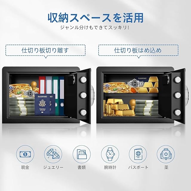 【様々な場所で活躍】通帳・現金などの貴重品はもちろん、A4用紙、パスポートや健康保険証、マイナンバーカードなどの個人情報の保管にも最適。仕切り板を外せば高さのあるアイテムも収納可能。自宅・オフィス・店舗など、さまざまな場所に設置できます。