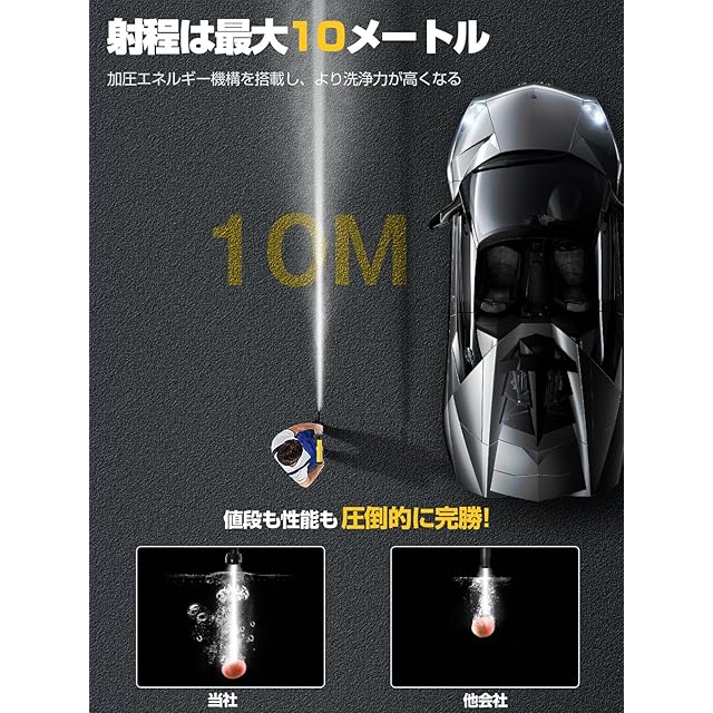 【洗車や大掃除に便利&調節可能】高圧洗浄機はブラシや雑巾といったほかの掃除道具と異なり、水を当てるだけなのでラクに掃除ができる点が大きな魅力です。2段階水压モードがあり、射程は最大10メートル、強力な水圧によって、長年蓄積したガンコな汚れを落とすことにもできます。オプションパーツは豊富で、自吸機能つきで汎用性が高く、小型のため持ち運びやすく、射を切り替える6in1ノズルや、洗車に便利な左右360°上下180°変換ノズル、フォームノズルが付き、扇型の水流で効率よく洗浄できます。車の下回り・雨どいなどの手の届きにくい場所の洗浄に適しています。一方、高圧ホースは接続しやすく、ノズルの先端を回転させることで6種類の水流を使い分けられる点は様々なシーンで大活躍!洗車や庭、屋外、階段、網戸・窓ガラス、ブロック塀、外壁、駐車場、玄関まわり、自転車・バイク、ベランダ、高い場所、家まわり、浴室、年末大掃除、キャンプ用品の清掃やBBQの片付けにも大活躍。