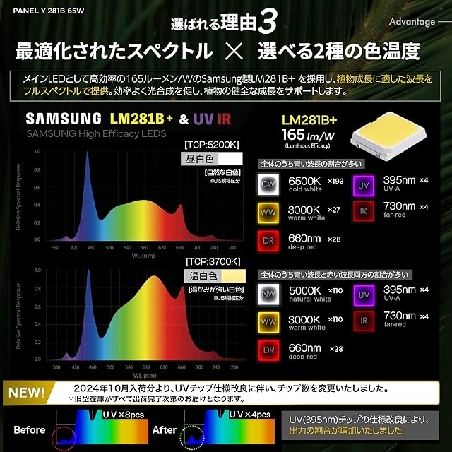 【Samsung製LED「LM281B+」を採用】 PANEL Yは、世界で幅広く利用されるSamsung製高性能LEDチップ「LM281B+」を搭載。380nmから780nmまでのフルスペクトルを提供します。植物の光合成を最大化し、成長を促進します。赤色、青色、緑色の波長がバランスよく配置され、理想的な光環境を提供します。