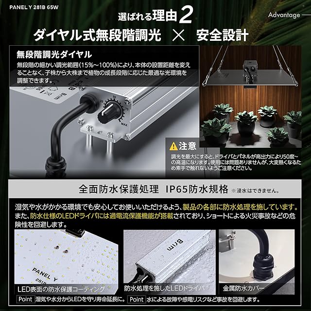 【こだわりに応える無段階調光機能】 PANEL Yは、ダイヤル式無段階調光機能を備え、光量を15%から100%まで自由に調整可能。植物の成長段階に合わせて、最適な光環境を提供します。 植物の成長段階に応じた最適な光量を提供し、エネルギー消費を抑えながら効果的に育成をサポートします。