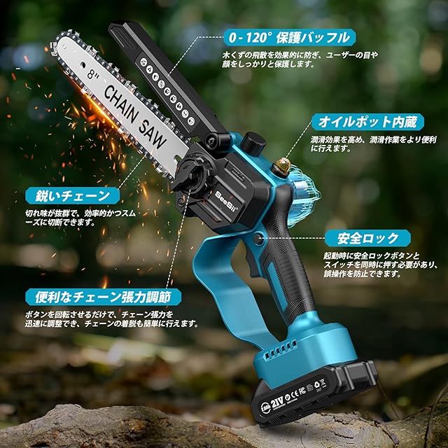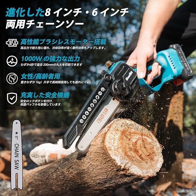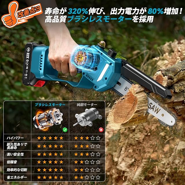 【ブラシレスモーターの優位性】一般的な電動ノコギリはブラシ付きモーターを使うことが多いですが、弊社製品は革新的なブラシレスモーターを採用!その利点はたくさんあります。① 安全性抜群:火花や煙が出ないので、安全に使えます。②長寿命:ブラシ交換不要で、耐久性が高く、安定した性能を維持します。③ 省エネ高出力:エネルギー消費が少なく、1 つのバッテリーでも長時間使えます。④作業性能安定:振動が少なく、作業効率と精度が高まります 。