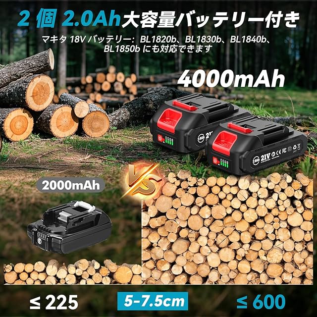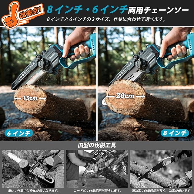 【6、8インチ両用コードレスチェーンソー】本体重量はわずか 1kg!2 セットのガイドバーとソーチェーン(6 インチ+8 インチ)を搭載し、強力な切断性能を発揮し、切断径は 15~20cm にも達します!大容量 2000mAh バッテリーを 2 つ装備し、残量表示機能付きで、しかも マキタの18V バッテリーと互換性があります。電源コードが不要なため、屋外作業には抜群の便利さを提供します。家庭の DIY プロジェクトから樹木の伐採まで、あらゆる作業に対応できる万能ツールです。さらに専用の収納ケース付きで、軽量設計のため持ち運びも大変簡単です。