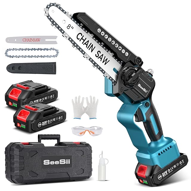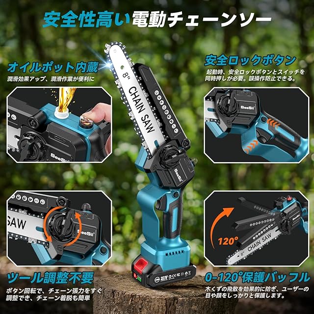 【2025新型】SEESII チェーンソー 充電式 ブラシレス 8インチ&6インチ両用 高枝切りの延長ポールと接続可能なたかえだ 電動 ハンディソー 2個21V 2.0Ah大容量バッテリー搭載 給油可能 工具レスチェーン調整 コードレス 強力 片手 軽量 木工切断 枝切り 薪作り 園芸設備 庭木の剪定 竹を切る C8